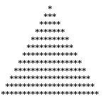Maak een pyramide, die slechts bestaat uit het asteriks symbool (*). Het resultaat dient dus tekst te zijn. Gebruik een for loop om de pyramide op te bouwen (die bestaat uit 10 lagen). Tip 1: probeer deze pyramide eerst in HTML te maken (stel jezelf de vraag, hoe centreer ik de verschillende lagen). Tip 2: Wellicht dat je het beste een monospaced lettertype kunt gebruiken (bijvoorbeeld: Courier). Tip 3: gebruik een variabele die je steeds uitbreidt met het asteriks symbool (kijk ook nog eens naar de les: teksten samenvoegen / concatenating string.