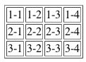 Zie bovenstaand voorbeeld. Maak een scipt dat deze tabel automatisch genereert. De waardes als 1-1, 1-2, 1-3, staan voor [rowNumber]-[colNumber]. Tip 1: Maak de tabel eerst in HTML, en bepaal welke waardes variabel zijn. Tip 2: gebruik een for loop in een for loop (één loop voor het genereren van de rijen, één loop voor het genereren van de kolommen). Je kunt één punt extra verdienen als je de tabel uitbreidt naar 10 kolommen en 30 rijen, waarvan elke oneven rij een grijze achtergrond kleur heeft (zoals je vaak in forums ziet).